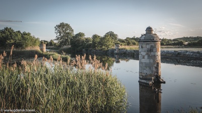 Kamienna Śluza jest jednym z najciekawszych obiektów hydroinżynieryjnych w Polsce. Powstała w latach 1619-1623, zaprojektowana przez Jana Strakowskiego według planów opracowanych przez Hollendrów z Alkmaaru: Willema Jansena Beninga i Adriaena Olbrantsena. Jednym z celów wzniesienia budowli, było napędzanie młyna miejskiego, który pełnił very ważną funkcję młyna rezerwowego. Nieprzyjaciel bez problemu mógł unieruchomić młyny Starego Miasta poprzez blokadę Kanału Raduni. Za pomocą pierwotnie drewnianych wrót śluzy, a od XIX wieku metalowych można było sztucznie podnosić stan Wód na Żuławach Wiślanych powodując "kontrolowaną" powódź, lub chronić miasto przed wodą morską, wtłaczaną podczas sztormów do Motławy. Na kamiennych grodzach można zobaczyć cztery dekoracyjne wieżyczki, oprócz wartości wizualnych pełniły one funkcje obronne, miały uniemożliwiać przejście wrogich żołnierzy po grodziach i zajęcia mostu. Na końcu znajduję się tak zwany rawelin, mały bastion zbudowany w XVII wieku. W 1656 armia szwedzka odstąpiła od oblężenia po zalaniu przedpola Gdańska.